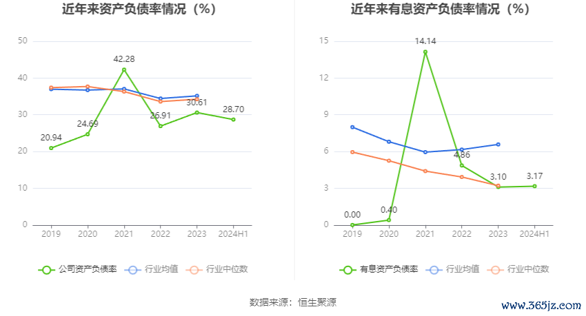 在偿债能力方面,公司2024年上半年末资产负债率为28.70%,相比上年末下降1.91个百分点;有息资产负债率为3.17%,相比上年末上升0.07个百分点。