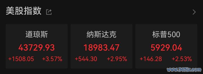 截至美股收盘,道指大涨1508.05点,涨幅为3.57%,报43729.93点;纳指涨544.30点,涨幅为2.95%,报18983.47点;标普500指数涨146.28点,涨幅为2.53%,报5929.04点。罗素2000小型股指数涨130.13点,涨幅为5.76%,收于2390.97点。