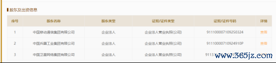 股东信息显示,该公司由中国卫星网络集团有限公司、中国兵器工业集团有限公司、中国移动通信集团有限公司分别持股55%、25%、20%。