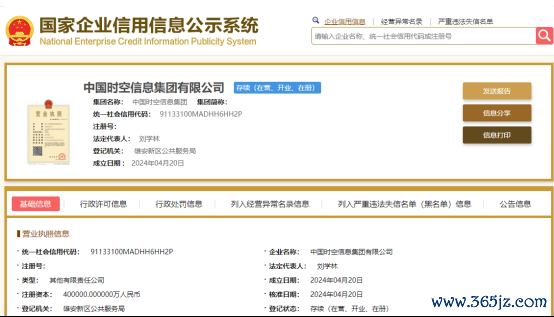 5月31日,记者获悉,中国时空信息集团有限公司于4月20日在雄安新区注册成立,注册资本40亿元。